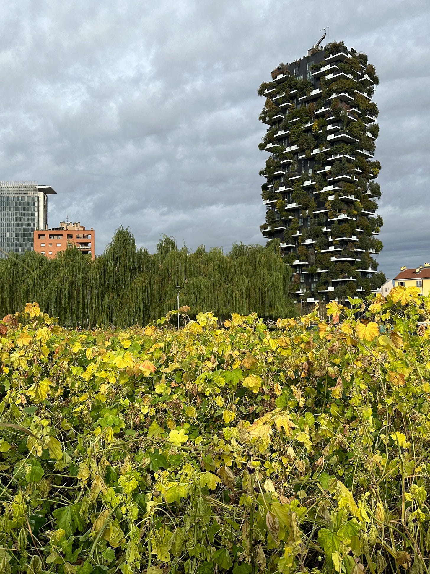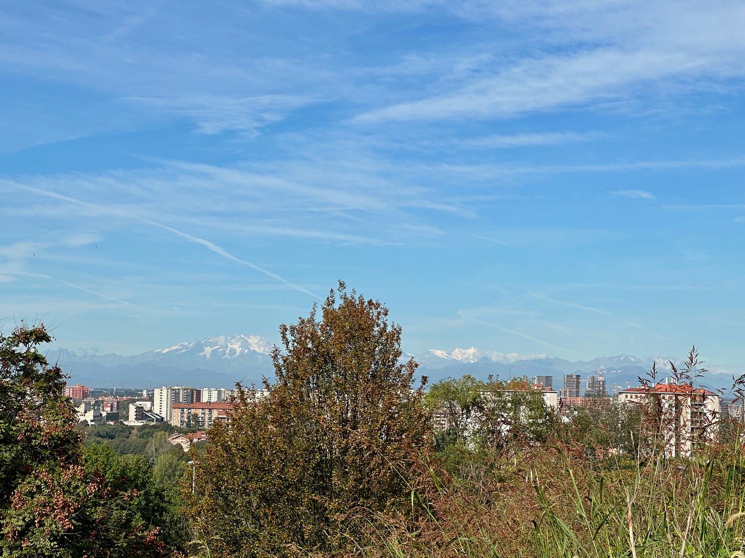 When we arrived last October, Milan was experiencing unseasonably warm and sunny weather, as we have been again the last month or so. But my walk with our dog this morning was—at last!—comfortably cool, only 14°C (57°F). It was as if summer had beat a hasty retreat after finally realizing it had overstayed its welcome. We passed by men hard at work in the park near our apartment, cutting down the past-its-prime vegetation in the foreground of this photo, preparing the field for a fallow season.