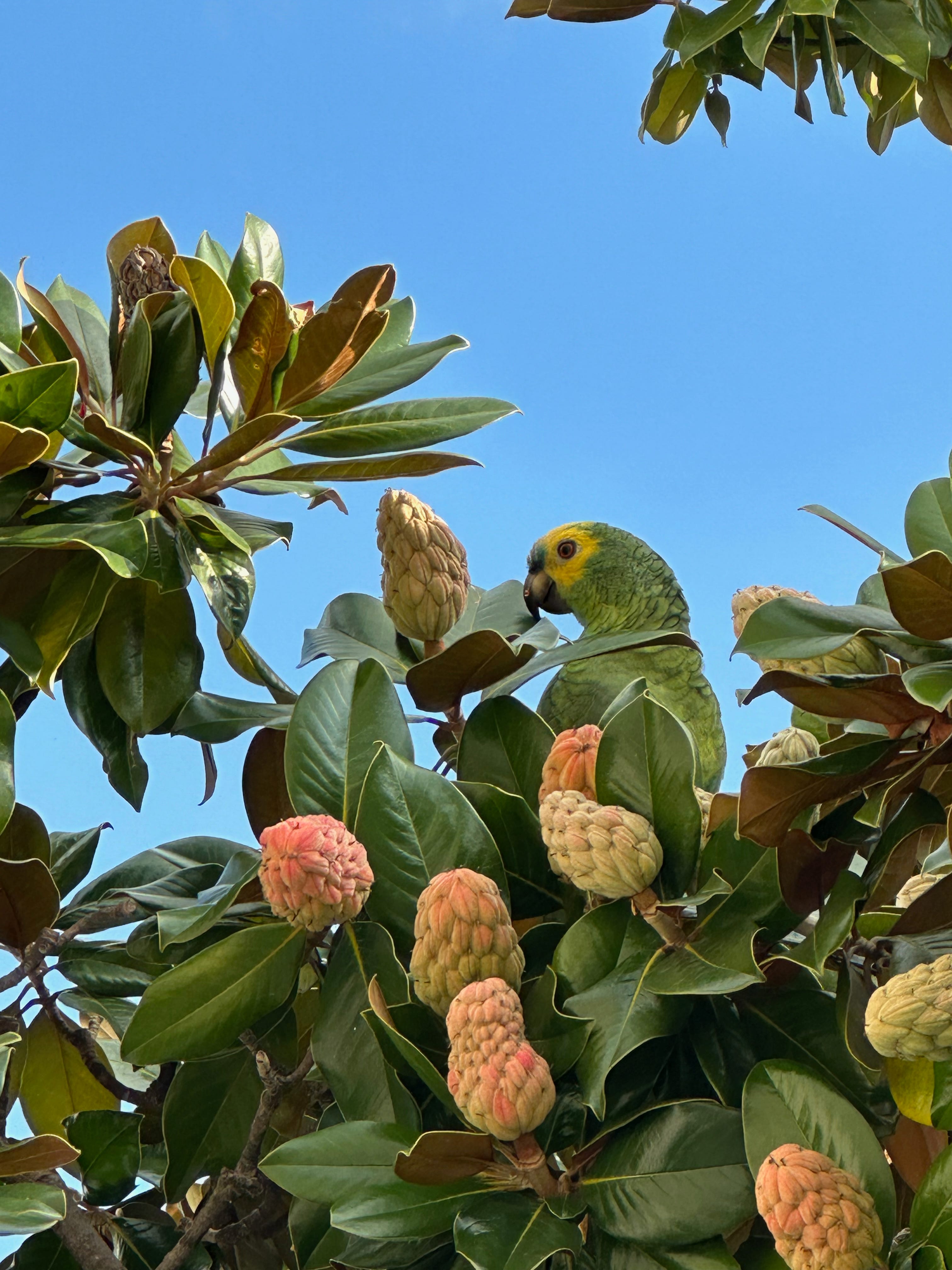 Last Friday, we took a day trip to Genoa to see a photography exhibition. While walking around the city afterward, we heard a squawking and I looked up to see this beauty playing hide-and-seek.